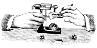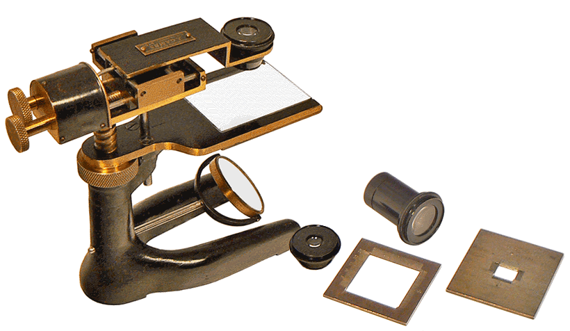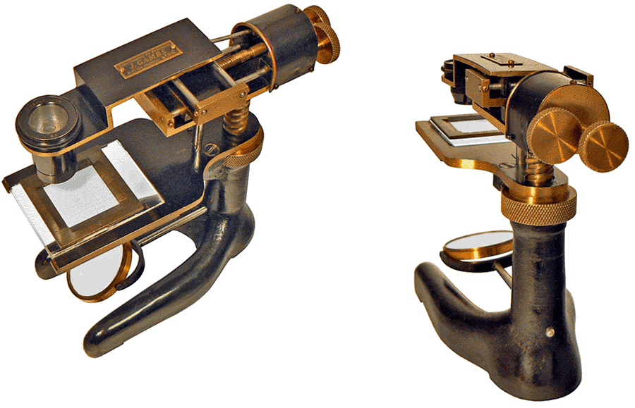 Destiné principalement à "l'examen des tissus et à la décomposition des fils et des brins le constituant", le microscope est livré avec trois doublets interchangeables donnant des grossissements de 6, 20 et 40 fois. Il est complété par deux calibres gradués en millimètres et en lignes. Le côté de la fenêtre du grand calibre correspond à 2,706 cm, soit 1 pouce de France divisé en 12 lignes. |