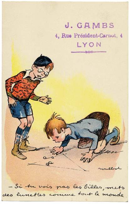 Cette carte postale fait partie d'une série dessinée par l'illustrateur POULBOT (1879-1946) et dont le thème est celui des enfants et des lunettes. Elle est utilisée, ici, comme publicité pour Joseph Gambs, opticien. |