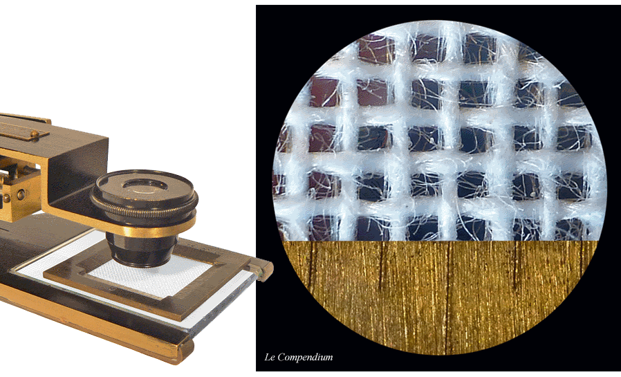 Pour juger de la densité de ce fin tissu, il suffit d'amener l'axe optique du doublet au-dessus du pourtour intérieur gradué du calibre. La lecture peut se faire sur l'une ou l'autre des graduations, en millimètres ou en lignes. |
