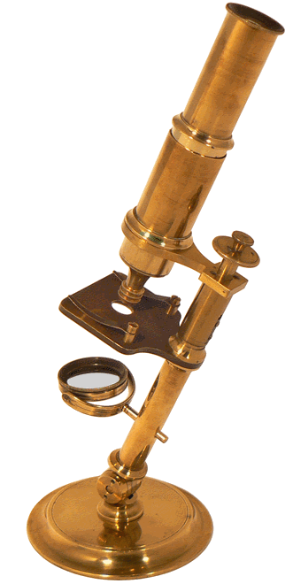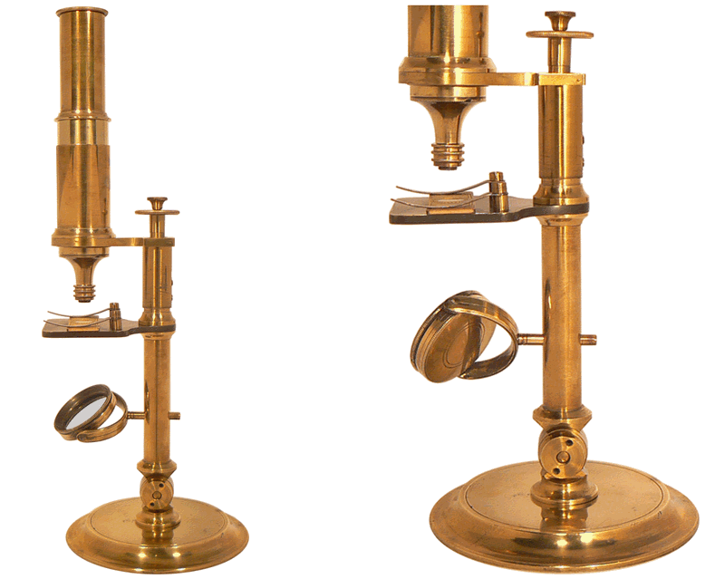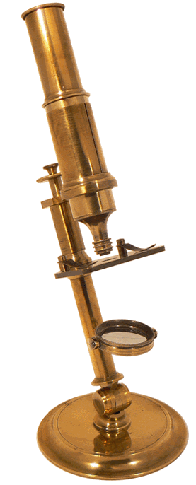 Microscope inclinable sur socle circulaire de 9,5 cm de diamètre - Hauteur minium 26,5 cm - Français, probablement - Vers 1860 |