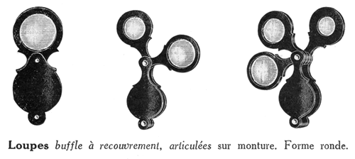 On rencontre ces loupes, à monture en corne de buffle, dans de nombreux catalogues de la fin du XIXe et du début du XXe siècle consacrés aux instruments d'optique, à l'étude des sciences, au matériel pour l'enseignement et aux accessoires pour les travaux fins. |