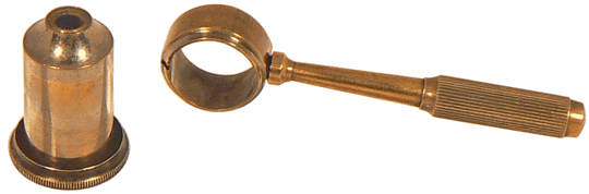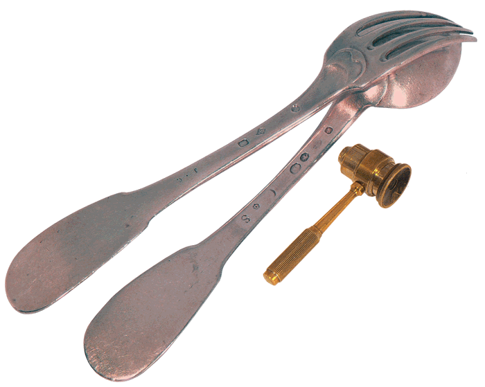 Ce doublet, qui convient pour les recherches visuelles délicates (horlogerie, pierres précieuses, etc), nous est apparu parfaitement approprié pour observer les poinçons des pièces d'argenterie. A travers ses lentilles, nous en avons photographié certains, présents sur une cuillère et une fourchette anciennes. Les empreintes ne sont pas récentes et elles présentent en surface de nombreuses