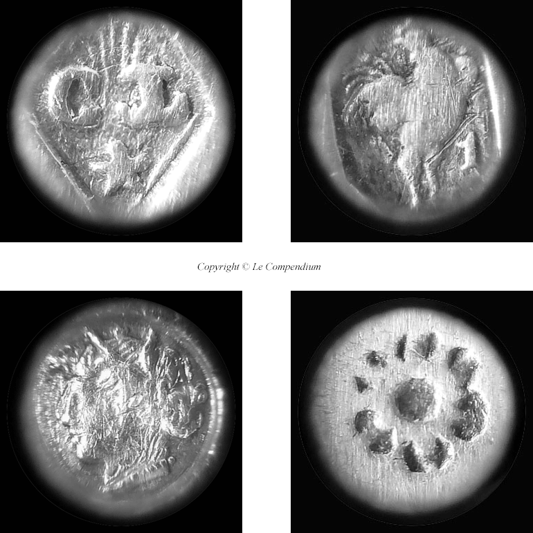 "C.L" sont inscrites dans un losange vertical. Vient ensuite, le poinçon de titre, symbolisé ici par un coq ayant la tête tournée à gauche et le chiffre "1" devant les pattes (argent 1er titre). En bas et à gauche figure le poinçon de garantie. La signification de la dernière empreinte nous est encore inconnue ... |