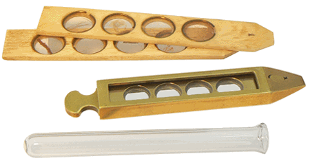 Dans le microscope, la mise en place d'une lame s'effectue entre deux glissières métalliques planes et lisses, l'introduction étant facilitée par la forme biseautée de l'extrémité de la lame. Le tube en verre est introduit par son fond arrondi et il est guidé par une troisième glissière en forme de gouttière semi-circulaire reposant sur une pièce en bois, présentant le même profil. Un ressort placé immédiatement sous l'œilleton porte-lentille exerce une pression sur les glissières et, par suite, sur la lame ou le tube qui se trouve ainsi immobilisé. Sur la photographie qui suit, les éléments évoqués, tous munis d'une fenêtre assurant le passage de la lumière, ont été extraits du corps du microscope, photographiés... puis replacés dans le bon ordre ! |