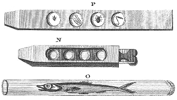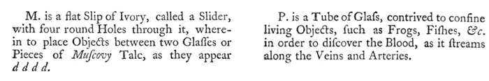 Dans THE MICROSCOPE MADE EASY, Henry BAKER propose une longue description de l'instrument sous le titre "Of Mr Wilson's single pocket microscope". La planche ci-dessus est tirée de la quatrième édition de l'ouvrage, parue en 1754. Au dessus de cette planche, nous avons illustré les extraits du texte d'accompagnement relatifs à la lame (M) et au tube (P) avec deux de nos photographies. |