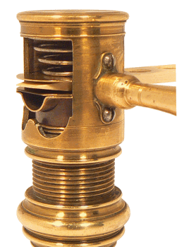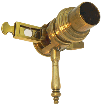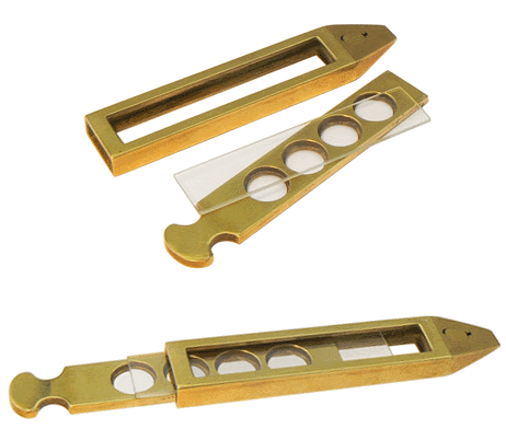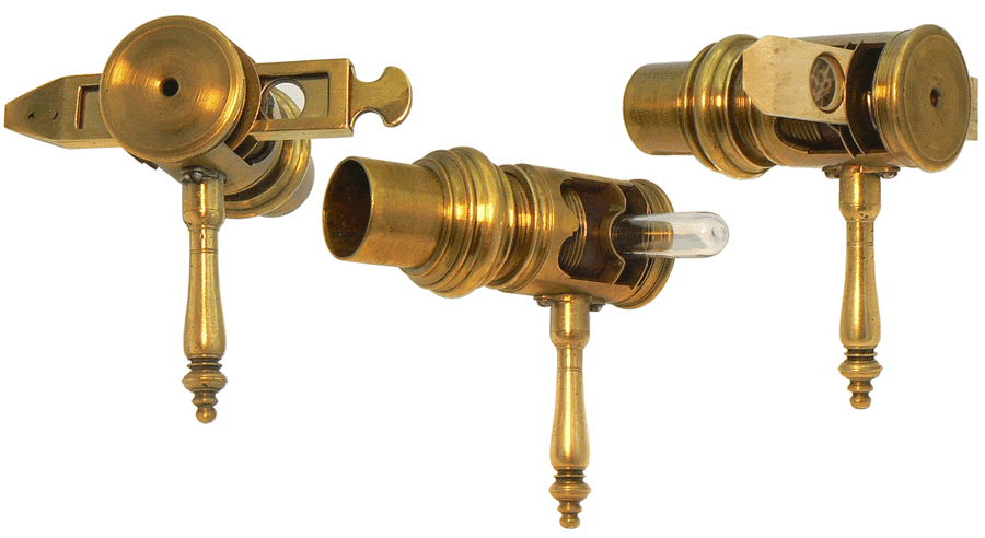 La lame coulissante ou porte-objets coulissant est un accessoire intéressant qui accompagne souvent les microscopes du XVIIIe siècle. Les objets étudiés sont momentanément confinés dans le faible espace ménagé entre, d'une part, les petits disques en verre sertis à la base des ouvertures circulaires d'une plaquette en laiton de 2 mm d'épaisseur et d'autre part, une lame en verre posée sur le dessus de la plaquette. L'ensemble étant introduit dans un cadre en laiton assurant une bonne cohésion, les petits objets, éléments de plantes ou animaux minuscules, peuvent être observés sans être écrasés ou détruits. |