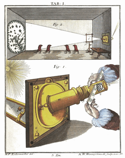 L'objet, une préparations placée dans le microscope, est éclairé par la lumière solaire réfléchie par un miroir extérieur et concentrée à l'aide d'une lentille convergente. Cet objet doit rester à une certaine distance du foyer de la lentille condensatrice pour ne pas être brûlé. De l'autre côté, la lentille d'observation du microscope de Wilson joue le rôle d'objectif de projection en donnant, sur l'écran de la salle obscure, une image très agrandie. |