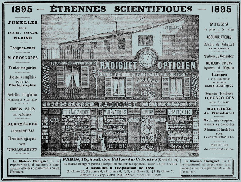 Cette publicité de la maison RADIGUET OPTICIEN est tirée de la revue LA NATURE. Elle date de la fin de l'année 1894. C'est un peu plus tard, en 1899, que Massiot rejoint Radiguet. La société devient alors RADIGUET & MASSIOT. En 1905, Radiguet décède et Massiot reprend la direction de l'entreprise. Entre temps, les deux associés ont racheté la maison MOLTENI, spécialisée dans la projection lumineuse. |