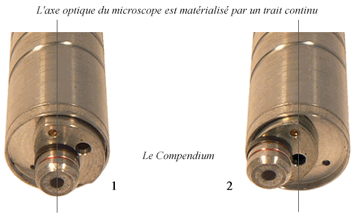L'objectif comprend deux parties distinctes. Une première partie, visible sur les photographies, est fixée à l'extrémité du tube optique sur une petite plaquette-support pivotante de forme ovale. Cette partie d'objectif peut être placée dans l'axe du tube optique (image 1) ou en être écartée (image 2). Dans ce dernier cas, l'ouverture circulaire ménagée dans la plaquette-support permet à la deuxième partie de l'objectif, invisible car située à l'intérieur du tube optique et dans son axe, de continuer à jouer son rôle. Les lentilles formant l'objectif sont donc utilisées en totalité (1) ou partiellement (2) selon la position de l'ensemble mobile ... |