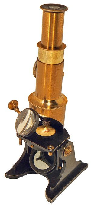 Notre microscope rappelle, dans sa partie supérieure, l'instrument photographié en noir et blanc, c'est-à-dire un microscope à niche typiquement français et de même hauteur. On aurait remplacé la base en forme de niche par un pied plus élégant, semblable à celui d'un microscope anglais ... L'ensemble, hybride, gagne en stabilité et il devient possible d'incliner le tube optique. Mais on remarque que le miroir a conservé son unique axe de rotation, ce qui est peu commode dans la recherche d'un l'éclairage optimum. |