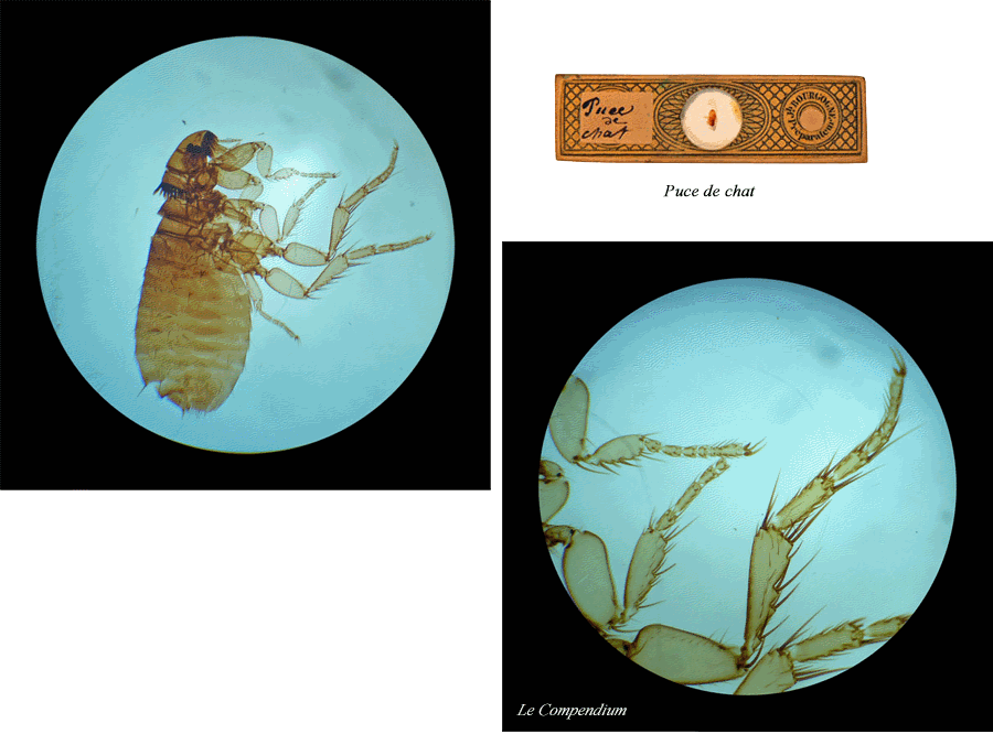 Le coffret de 28 x 13,5 x 12 cm renferme le microscope et ses accessoires. Au premier plan, à gauche des lames préparées par Joseph Bourgogne dans la deuxième partie du XIXe siècle, est posée la "dame" dont la forme et les dimensions rappellent celles des pions du jeu qui en portent le nom : on choisit la face, ébène ou ivoire, pour fond, lors de l'observation d'objets opaques. A droite, la "cuve à fond de glace et à parois de cuivre" - telle que l'évoque Arthur CHEVALIER dans L'ETUDIANT MICROGRAPHE (1865) - "pour l'examen de la circulation du sang dans les nageoires des très petits poissons et dans la queue des têtards de grenouille". Cette cuve se pose sur la platine du microscope et des dispositifs sont imaginés par le microscopiste pour y maintenir les spécimens dans l'immobilité complète ... La loupe d'éclairage des objets opaque est, actuellement, montée sur la platine du microscope. |