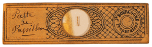 Le coffret renferme quelques lames préparées par Joseph BOURGOGNE, premier de la lignée des BOURGOGNE et souvent considéré comme un des meilleurs microscopistes du XIXe siècle. Il s'agit de préparations de 6 x 1,6 cm, entre lame et lamelle, enveloppées dans du papier coloré. Nous avons photographié trois de ces lames qui peuvent avoir plus de 150 ans ... |