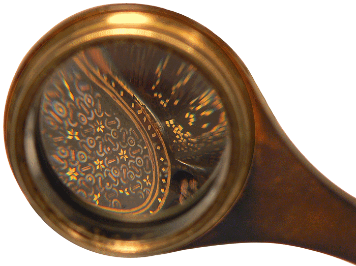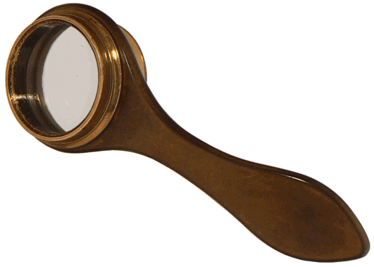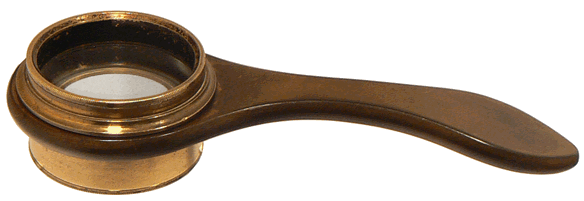 L'expérience montre que les contours des images données par l'utilisation d'un système de deux lentilles présentant des courbures moindres que celles d'une lentille unique de même puissance, permet d'obtenir des images moins irisées. Pour cette raison, la partie optique de notre loupe est formée par deux lentilles plan-convexes de 5,5 centimètres de diamètre disposées parallèlement et à faible distance l'une de l'autre. Le manche en corne est légèrement incurvé ce qui permet une bonne préhension de l'instrument dont la longueur totale est égale à 16,5 cm. |