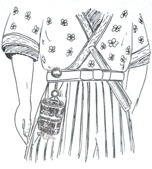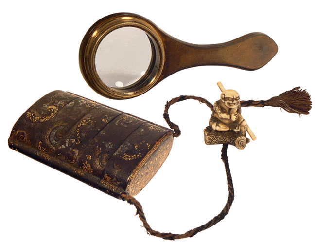 Le netsuke est traversé par une cordelette en soie qui retient et guide les compartiments d'une boite laquée appelée inro permettant de ranger différentes petites choses comme, par exemple, des médicaments. Il sert à accrocher l'ensemble sous la ceinture du kimono dépourvu de poche ... |