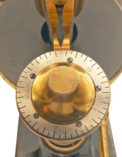 Un tour correspond à un déplacement vertical de l'objectif d'un quart de mm et chaque grande division à 0,01 mm. |