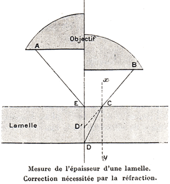 La figure ci-dessus, empruntée à l'ouvrage de Langeron, correspond à la mesure de l'épaisseur d'une lamelle. Elle accompagne une description particulièrement claire : La partie gauche nous montre l'objectif mis au point sur E, dans le plan supérieur de la lamelle. Pour mettre ensuite au point sur le plan inférieur, il semblerait qu'on doive l'abaisser de la quantité ED, mais en réalité il suffit de le déplacer de la quantité ED' car, après réfraction, les rayons partis de D paraissent suivre le trajet BD'. Pour connaître l'épaisseur réelle de la lamelle, il faut multiplier la différence entre les deux chiffres lus sur la vis micrométrique par l'indice de réfraction du verre de cette lamelle. |