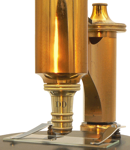 L'instrument est doté d'un oculaire n°4 et d'un objectif DD pour un grossissement voisin de 400 fois. Il possède un appareil d'éclairage d'Abbe composé d'un miroir double plan et concave, d'un diaphragme iris excentrable et d'un condenseur à deux lentilles. |