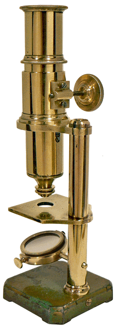 Ces microscopes diffèrent par la taille et les finitions qu'ils proposent. Le plus petit, à gauche, porte de numéro 26 et est muni d'un dispositif de mise au point par système pignon-crémaillère ; l'éclairage est assuré par un miroir concave. L'autre possède, sur sa platine, des valets de maintien de la lame porte-objet et c'est un miroir plan qui est utilisé pour l'éclairage. Ce deuxième modèle ne porte pas de numéro de fabrication. |