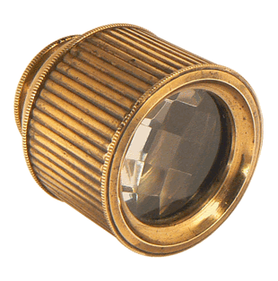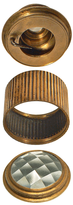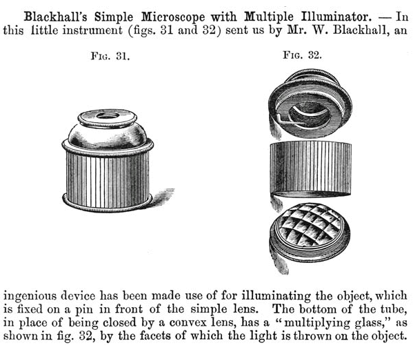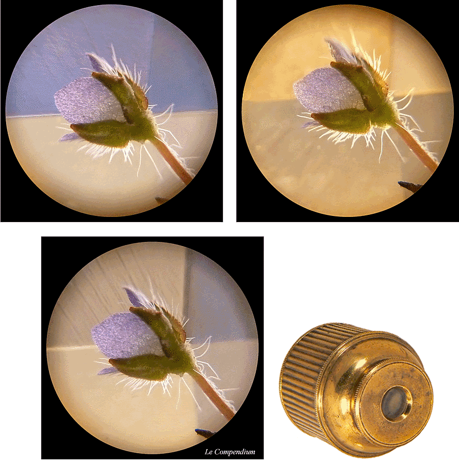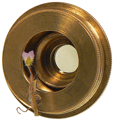 Ce microscope simple est davantage un divertissement qu'un instrument d'observation. Nous y avons placé une minuscule plante, la Véronique petit-chêne. La lentille plan-convexe multifacettes se comporte comme un ensemble de sources lumineuses de faible intensité dont certaines, les plus éloignées du centre, éclairent le sujet de biais. Mais cela n'est possible que si l'objet ne couvre qu'une partie réduite du champ car la lumière ne contourne toujours pas l'obstacle pour éclairer la face observée, même dans l'élégant microscope de Blackhall !