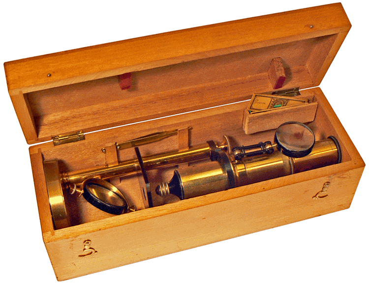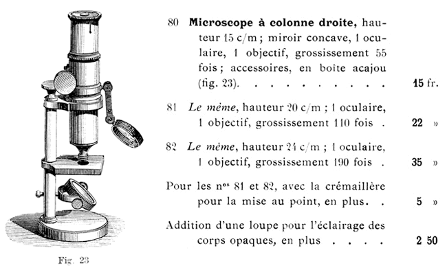 Vers 1900 et si on se réfère aux catalogue de la Maison Boucart, notre modèle de 24 cm de hauteur, grossissant 190 fois, muni de sa loupe pour éclairer les objets opaques et présenté dans une boite en acajou de 27 x 10 x 9 cm avec accessoires, c'est-à-dire une pince fine, une lame vierge et une ou deux lames préparées, était vendu 37,50 francs. Il fallait débourser 5 francs de plus pour obtenir la mise au point par pignon et crémaillère. |