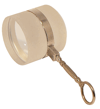 La loupe de Stanhope est un cylindre en verre dont une face est convexe et joue le rôle de face de sortie, l'autre face étant plane. Cette face plane se trouvant au foyer de la face convexe, il suffit de poser la loupe par cette face plane et, éventuellement, de la faire glisser sur un document ou un tissu pour en observer une partie agrandie. Aucune mise au point n'est nécessaire... |