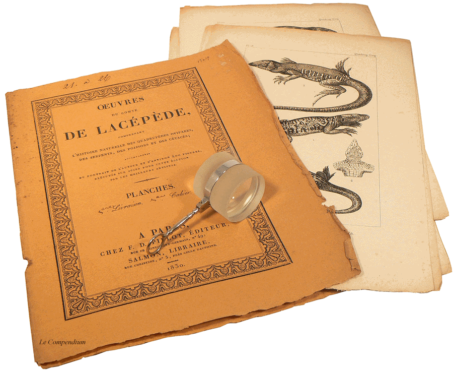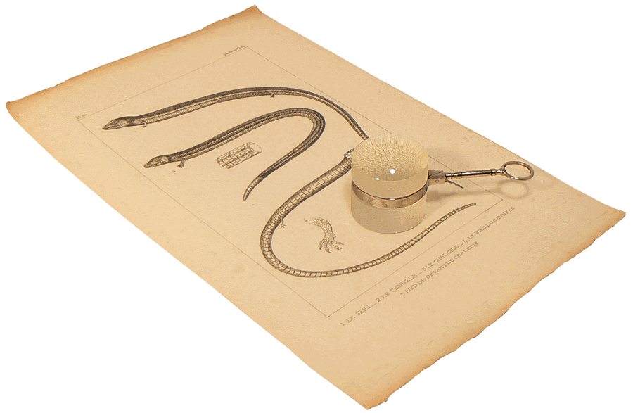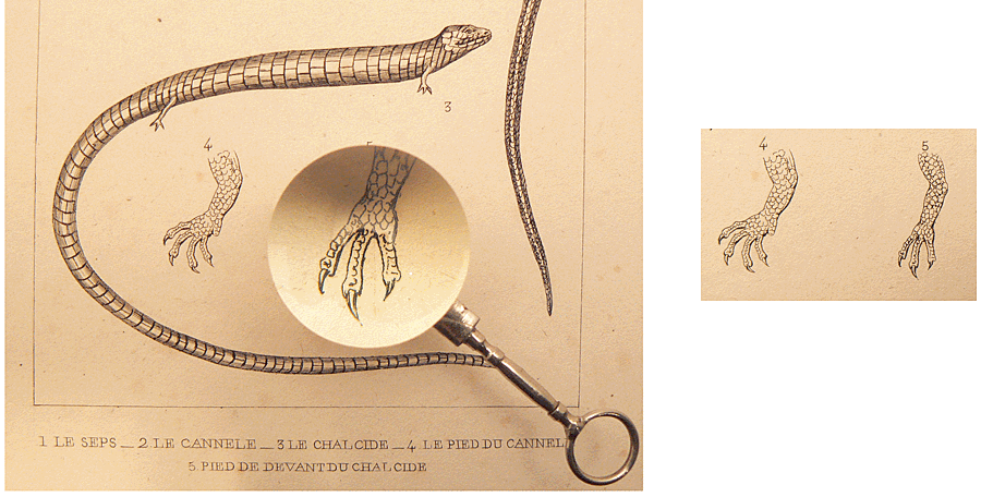 Si l'on compare le pied du modeste saurien échappé des Œuvres du Comte de Lacépède, observé à l'oeil nu et à travers la loupe, on voit que le grossissement est légèrement supérieur à 2 fois, ce qui est classique pour une loupe de lecture. En fait, le grossissement dépend du rayon de courbure de la face convexe de la loupe : plus ce rayon est faible, donc plus la convexité est prononcée, plus le grossissement est élevé. Certains dispositifs utilisent une lentille semblable à celle qui est présentée sur cette page, mais aux dimensions minimisées. La face de sortie est fortement convexe ce qui permet d'obtenir une image très agrandie de l'objet en contact avec la face plane. Cet objet peut être en contact provisoirement mais il peut aussi s'agir d'une microphotographie fixée à demeure. Les liens qui suivent mènent à des pages du Compendium traitant de ces applications de la lentille imaginée par Lord Charles Stanhope ... |