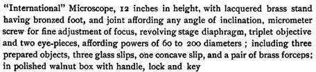 Dans la configuration de la photographie ci-dessus, la hauteur de l'instrument est de 30 cm, ce qui correspond à celle de "l'International Microscope", très ressemblant et proposé à la fin du XIXe siècle par B. KAHN & SON (New York) dans son catalogue OPTICAL and METEOROLOGICAL INSTRUMENTS Manufactured and Imported. Son histoire, les éléments qui l'accompagnent et le coffret nous amènent à penser que le microscope est une fabrication française des années 1870. |