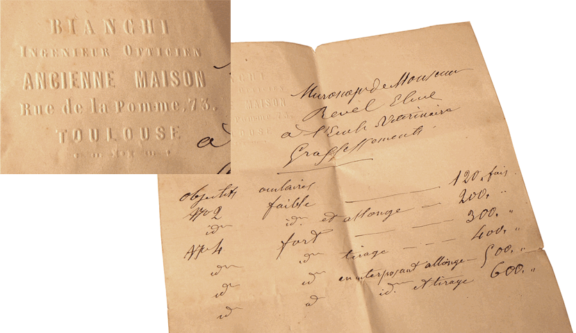 Le coffret contient un document à l'entête de BIANCHI Ingénieur Opticien, fournisseur de matériel de physique de la deuxième moitié du XIXe siècle. Adressé à l'acquéreur du microscope, il renseigne sur les grossissements obtenus selon l'optique choisie et l'éventuelle utilisation d'une allonge. |