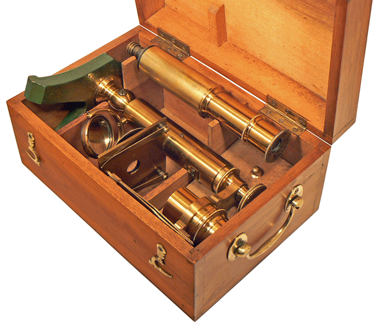 Le microscope, en partie démonté, dans son coffret en noyer de 22 x 14,5 x 11 cm. |