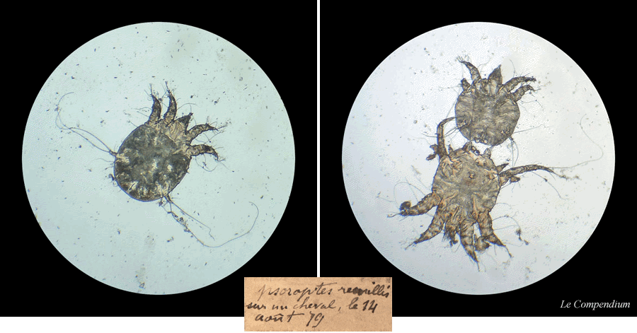 A droite, deux psorotes, male et femelle, au moment de l'accouplement. Ces acariens, parasites des mammifères, comprennent des espèces responsables de la gale psoroptique... |