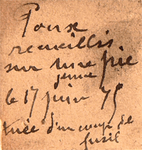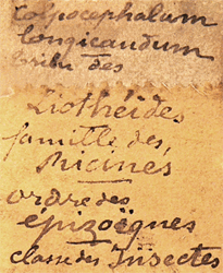 Sur la préparation dont le sujet est photographié ci-contre, une première étiquette porte le nom "pou de pigeon" et sa date de réalisation, le 21 septembre 1882. Une deuxième étiquette précise qu'il s'agit d'un Colpocéphale à longue queue, appartenant à l'ordre des épizoïques (il s'agit bien des poux), de la classe des Insectes. |