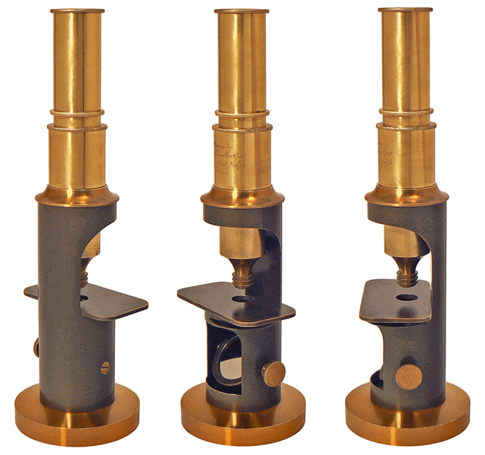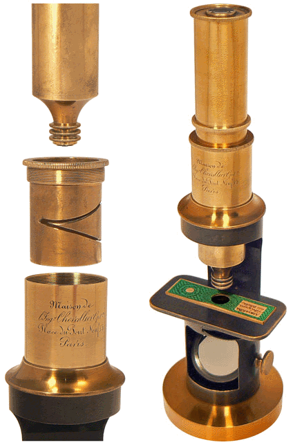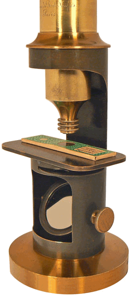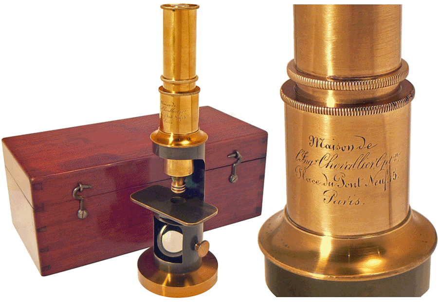 Le microscope, qui date probablement de la fin des années 1840, porte la marque gravée de L'Ingénieur CHEVALLIER (Jean Gabriel Auguste, opticien fabricant d'instruments de physique, de mathématiques et d'optique à partir de 1796). Le patronyme s'écrit avec 2 L et il ne faut pas le confondre avec celui de la dynastie des CHEVALIER : Louis-Vincent, Jacques-Vincent, Charles puis Arthur, également opticiens et microscopistes à Paris à partir de 1765 et durant une grande partie du XIXe siècle. |