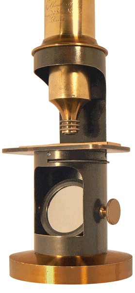 L'instrument est équipé d'une platine rectangulaire de 7 x 3,7 cm, d'un disque-diaphragme à 3 trous et d'un miroir concave. |