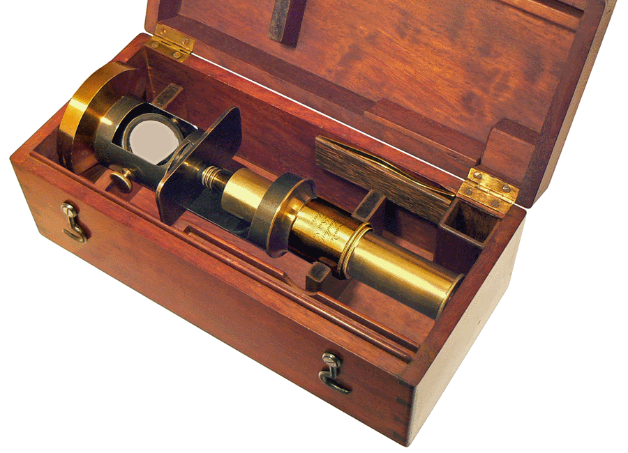 L'image qui suit est celle du coffret en acajou. Le logement dans le coin supérieur droit devait probablement contenir une petite auge parallélépipédique à parois en cuivre et à fond en verre, utilisée pour observer des petits animaux et plantes aquatiques... |