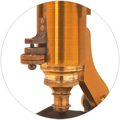 Le réglage primaire du microscope est assuré par système classique de pignon-crémaillère. L'optique est portée par deux tubes coaxiaux. Celui dont le diamètre est le plus grand reçoit l'oculaire alors que l'objectif est vissé à la base du tube intérieur, plus court. Deux petites pattes en forme d'équerre sont fixées, chacune à l'un des tubes. Elles sont reliées entre elles par une vis que commande une petite roulette moletée. La rotation de la roulette provoque le déplacement vertical de la patte inférieure fixée au tube intérieur. Par suite, cette manœuvre entraîne l'objectif sans déplacer l'oculaire : c'est un dispositif de mise au point fine que l'on rencontre surtout sur les instruments anglais du XIXe siècle. |