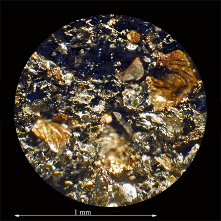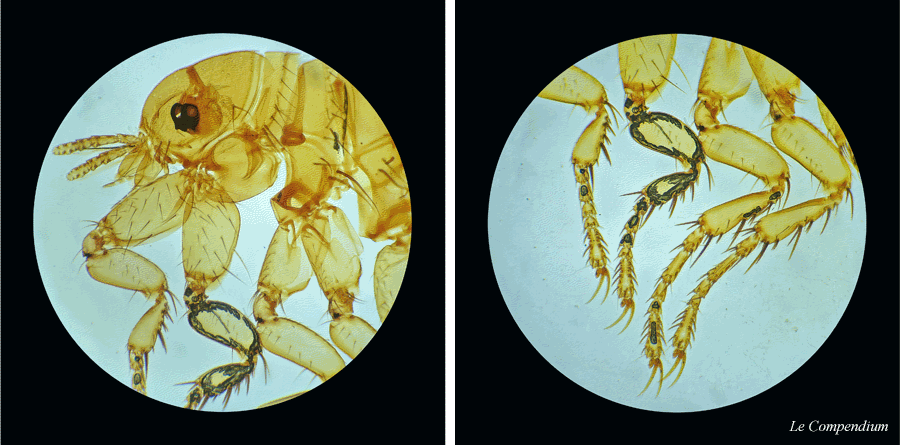 Les lames préparées par Joseph Bourgogne, il y a plus de 150 ans, sont en bon état de conservation comme le montre cette puce humaine ou la préparation opaque de cuivre pyriteux dans du quartz d'Angleterre. Le grossissement choisi pour les images est volontairement faible - nous avons utilisé une seule lentille pour l'objectif - et on remarque que le champ de vision offert par le microscope est tout de même réduit. |