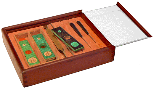 Le microscope est accompagné d'une cassette en acajou et à couvercle en verre contenant, dans différents logements capitonnés d'un fin velours, une dizaine de lames montées dont la majeure partie est signée Joseph Bourgogne, une pince fine, et deux aiguilles montées. Un scalpel fin et sans doute une spatule ont disparu. Dans le coffret en acajou de construction particulièrement soignée, la cassette prend sa place sous le tube optique du microscope. Un autre emplacement permet de loger une loupe articulée, utilisée pour l'éclairage des objets opaques. |