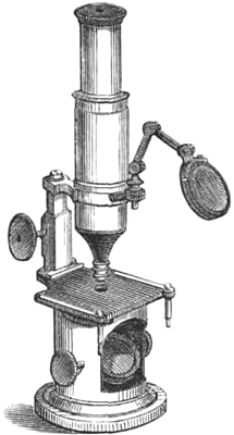 La mise au point est réalisée par le coulant et par un système pignon-crémaillère monté sur une colonne à section carrée. L'objectif, scindable, est composé de trois lentilles achromatiques. La loupe d'éclairage des objets opaques est particulièrement élégante. L'instrument n'est pas signé. |