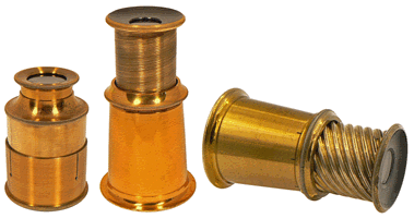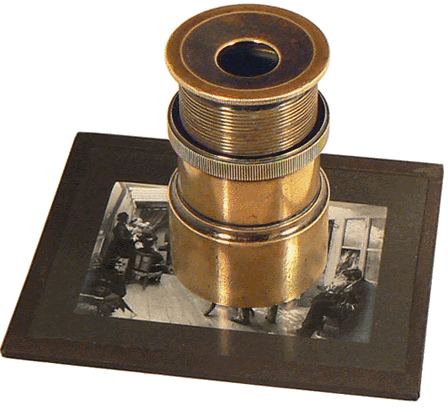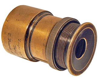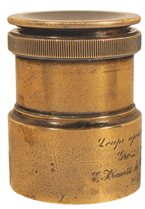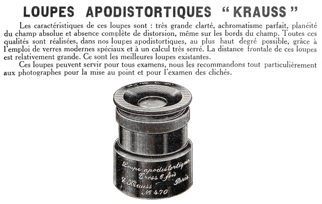 Il s'agit d'une loupe de mise au point qu'utilisaient, autrefois, les photographes. Elle renferme un doublet constitué d'un ménisque divergent et d'une lentille biconvexe. Le système optique résultant, dont l'épaisseur est réduite au minimum et dont les verres sont d'espèces différentes, contribue à la planéité du champ et à la suppression des effets de distorsion d'où le nom donné par Krauss, à l'instrument. On parlerait probablement aujourd'hui de loupe orthoscopique, c'est-à-dire donnant une image géométriquement semblable à l'objet. |