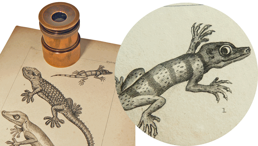 La loupe de Krauss peut être utilisée pour l'observation d'objets opaques. En effet, sa distance focale proche de 5 cm permet, lorsque le tube optique est complètement rentré dans la monture, de laisser un espace suffisant entre la base de cette monture et l'objet opaque examiné, pour qu'il soit correctement éclairé. Bien sûr, la monture ne prend plus appui sur l'objet comme cela pouvait être le cas lors de la précédente utilisation. Ainsi, nous avons photographié un des sujets d'une planche appartenant aux Œuvres du Comte de Lacépède. |