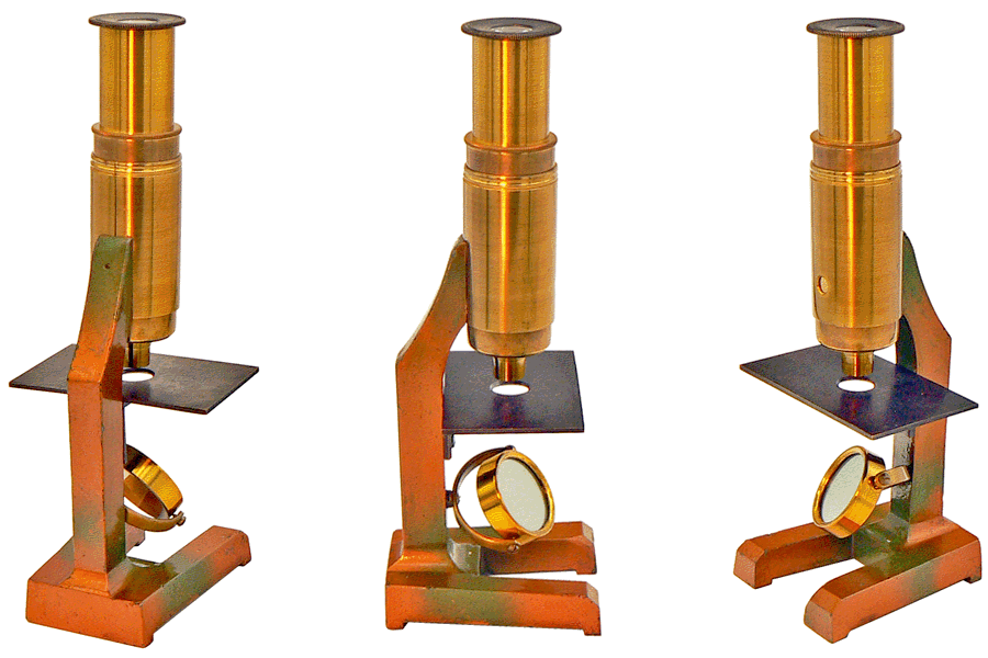 On rencontre ce petit microscope dans le catalogue "BUSIEST HOUSE IN AMERICA" de 1896 et en 1915 chez B. A. & Co, CHICAGO. Sa hauteur minimum est égale à 17 cm. Il est livré avec deux objectifs permettant des grossissements de 60 et 80 fois. Il est probablement de fabrication française. |