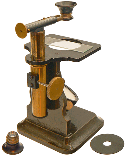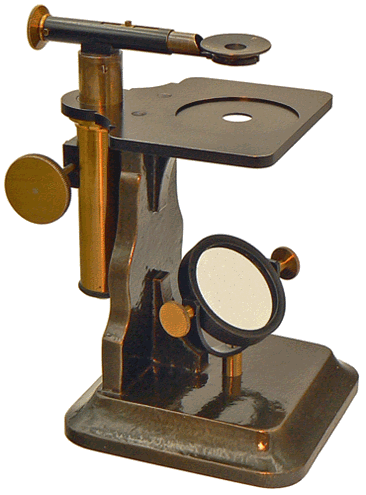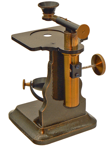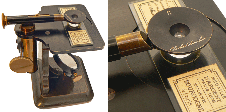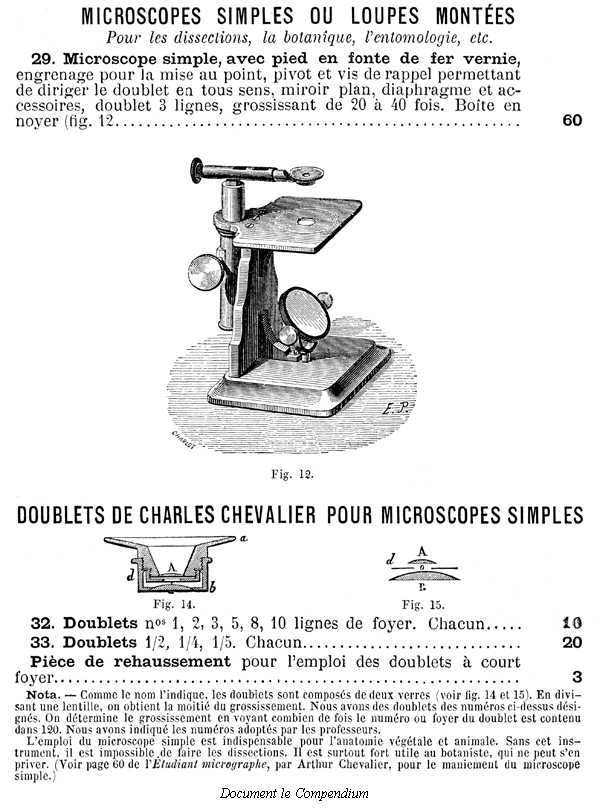 Avec son nouveau doublet, le microscope est identique à celui de la figure 58 de L'ÉTUDIANT MICROGRAPHE par Arthur CHEVALIER dans la seconde édition de 1865, ou à celle du catalogue de 1885 : |