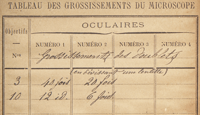 Les doublets de Charles Chevalier sont numérotés suivant leur distance focale exprimée en lignes. La ligne de France, ancienne unité de longueur égale à 1/12 pouce du Roi ou pouce de France de 2,707 cm, c'est-à-dire à 2,256 mm. Ainsi, le doublet n° 3 utilisé pour observer cette lame préparée par Eugène Bourgogne a une distance focale proche de 6,75 mm. Son grossissement est de 40 fois. La maison Chevalier proposait des doublets grossissant de 12 à 500 fois... |