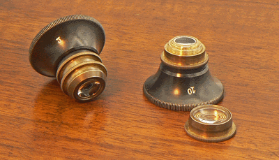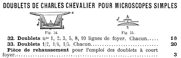 Le doublet optique, inventé par WOLLASTON en 1820, est composé de deux lentilles plan-convexes à face plane tournée vers l'objet ce qui réduit les aberrations de sphéricité et de réfrangibilité résultant de l'emploi de la lentille biconvexe unique utilisée jusque-là. En 1830, Charles CHEVALIER améliore ce système optique en éloignant le foyer afin de laisser un espace suffisant aux instruments de dissection. On y retrouve les deux lentilles plan-convexes, la première, près de l'objet, de plus grand diamètre que la seconde dont elle est séparée par un diaphragme. Les lentilles sont accouplées par leur monture à vis et leur écartement est faible et invariable. La monture supérieure porte une large collerette noire qui protège l'œil de toute lumière parasite. La forme la plus connue des doublets de Charles Chevalier est différente de celle des deux articles qui accompagnent notre instrument. Le diamètre de leur monture est identique puisqu'ils se montent sur tous les microscopes du constructeur mais ils sont beaucoup plus courts et la collerette, presque plate, est marquée "Charles Chevalier". |