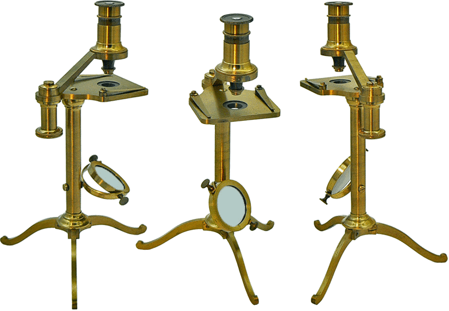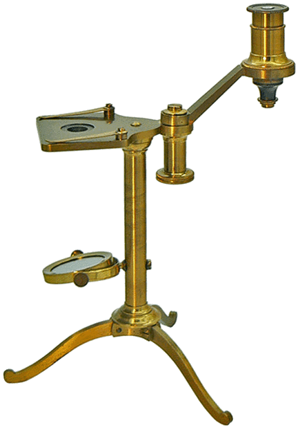 THE GOLUB COLLECTION (University of Californy, Berkeley) renferme un microscope, de finition argentée, possédant le même statif (No.140 - Compound Microscope made of Silver) : le tube optique, plus important, est muni d'un système de mise au point par pignon et crémaillère. |