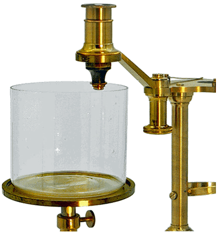 Commandée par un bouton moleté, la potence supportant le tube optique pivote ce qui permet, après une rotation à 180°, de transformer l'instrument en microscope aquatique pour observer des animalcules évoluant au voisinage de la surface d'un liquide contenu dans une cuve en verre. |
