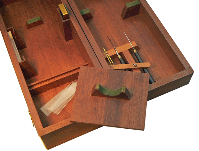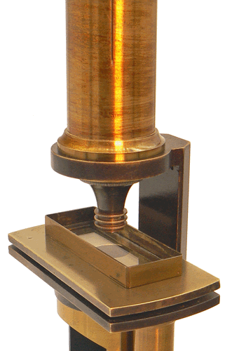 Une "cuve à fond de glace et parois de cuivre" telle que celle qui est évoquée par Arthur Chevalier en 1864 dans L'ETUDIANT MICROGRAPHE, accompagne l'instrument. Elle est utilisée pour les observations en milieu liquide et, par exemple, pour l'examen de la circulation du sang dans les nageoires des très petits poissons ou dans la queue des têtards de grenouille. |
