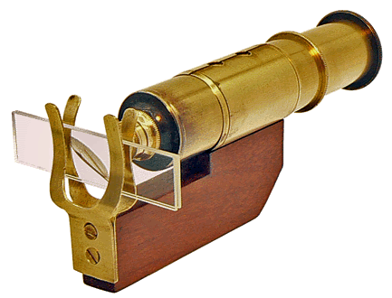 "JAMES PARKES AND SON" propose l'instrument dans son catalogue de 1857 sous le titre Children Portable Compound Microscope. On peut y observer les préparations du commerce ou, par exemple, des constituants de fleurs, des pattes et ailes d'insectes, placés entre deux lames en verre maintenues l'une contre l'autre par des pinces en forme de lyre. Ces pinces et le support du tube optique, sont fixés à une potence en acajou verni. |