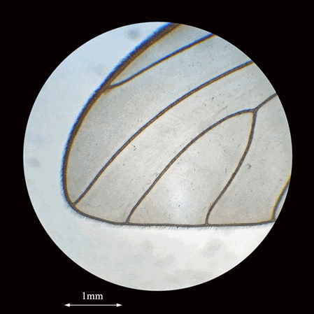 Le grossissement, de l'ordre de quarante fois, nous permet de visualiser les nervures d'une aile de Tipule disposée entre les deux lames et d'apprécier, sans difficulté, des détails de dimensions de l'ordre du 1/10 millimètre... |