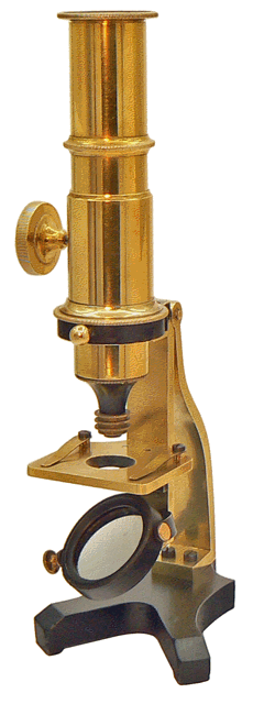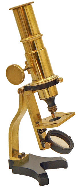 Le Compendium renferme un deuxième microscope du même type, plus petit et plus simple, que l'on peut retrouver en cliquant sur l'image de gauche. Il est identique en ce qui concerne sa colonne plate incurvée ainsi que son articulation, mais le pied - en forme de Y et en fonte chez le modèle de la page actuelle - est circulaire et en laiton lesté de plomb. Ce petit microscope possède le même objectif scindable, caractéristique des modèles français de la fin du XIXe siècle. Aucune marque ne figure ni sur l'un ni sur l'autre de ces deux instruments... |